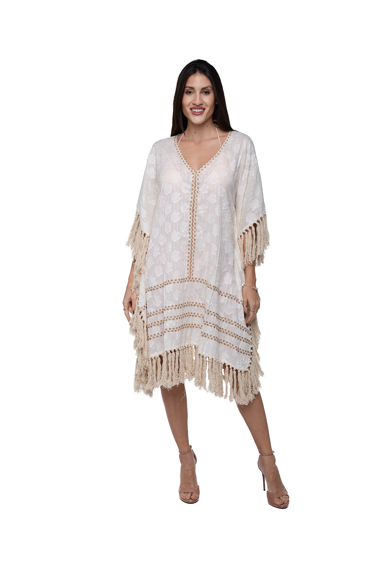 Elegant white embroidered kaftan with fringe hem